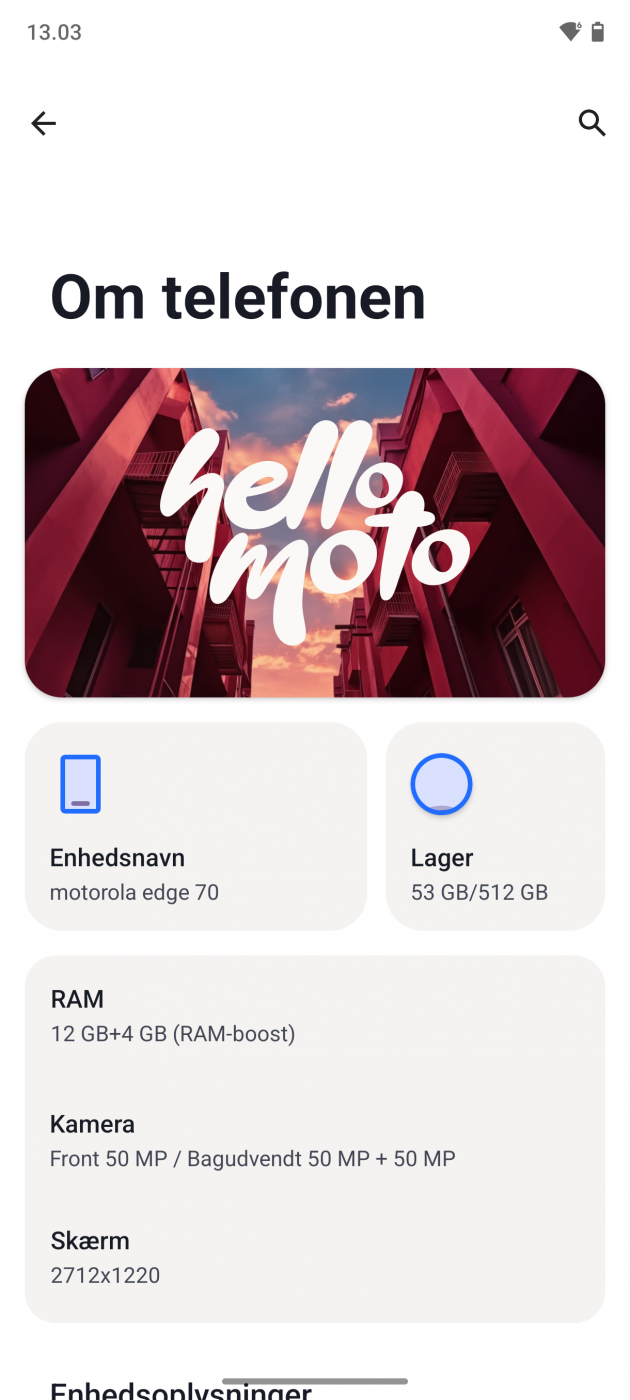 Edge 70 kører Android 16 med Motorolas egen Smart Connect-oplevelse og op til fire store OS-opdateringer. Systemet føles rent, hurtigt og uden tung bloatware, hvilket giver en oplevelse tæt på “stock Android”.