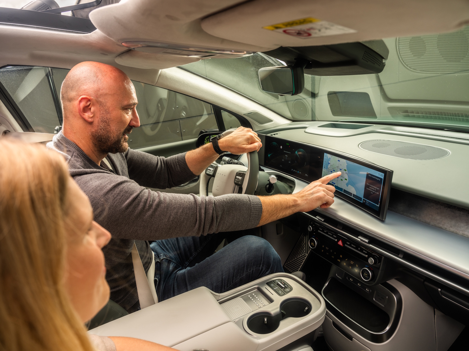 Allerede i Advanced-versionen er IONIQ 9 spækket med udstyr. Bag rattet har du en 12,3 tommer digital instrumentering og en stor touchskærm med navigation, der giver dig overblik over både rute, infotainment og batteristatus. Den indbyggede Bluelink-appforbindelse gør det muligt at forvarme kabinen, tjekke batteriet eller planlægge ladestop direkte fra din telefon. Smartphone kan spejles trådløst via Apple CarPlay og Android Auto, så du an bruge dine egne apps uden at rode med kabler. Forudsætter blot et Bluelink-abonnement.