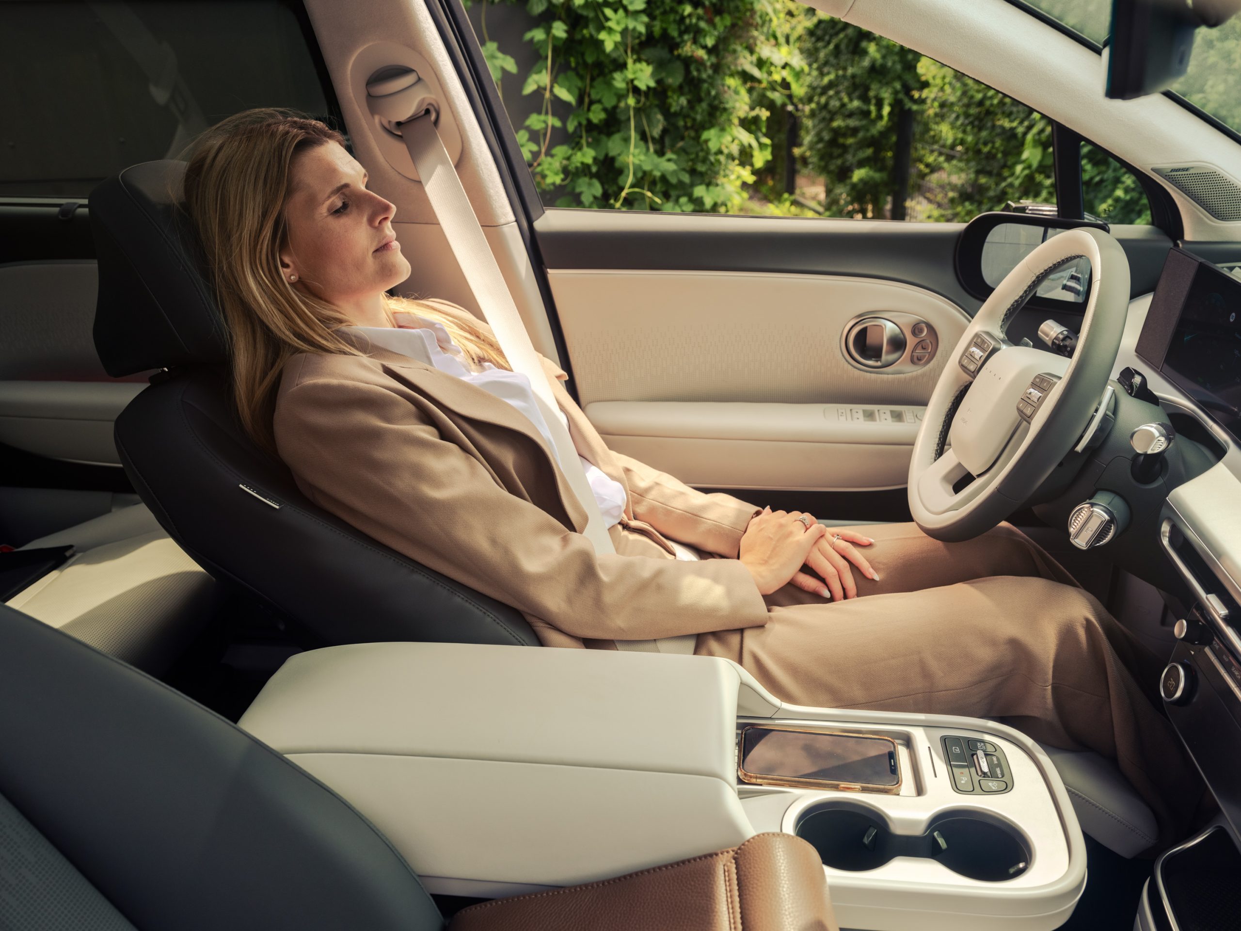Førersædet er elektrisk justerbart med udvidet benstøtte, hukommelsesfunktion og med en relaxation-indstilling. I relaxation-indstillingen lænes både ryglæn og sæde automatisk tilbage, så du kan slappe helt af i en næsten liggende stilling. Sædet støtter både ben, lænd og skuldre optimalt, hvilket gør det ideelt til en pause under opladning, eller når bilen holder stille.