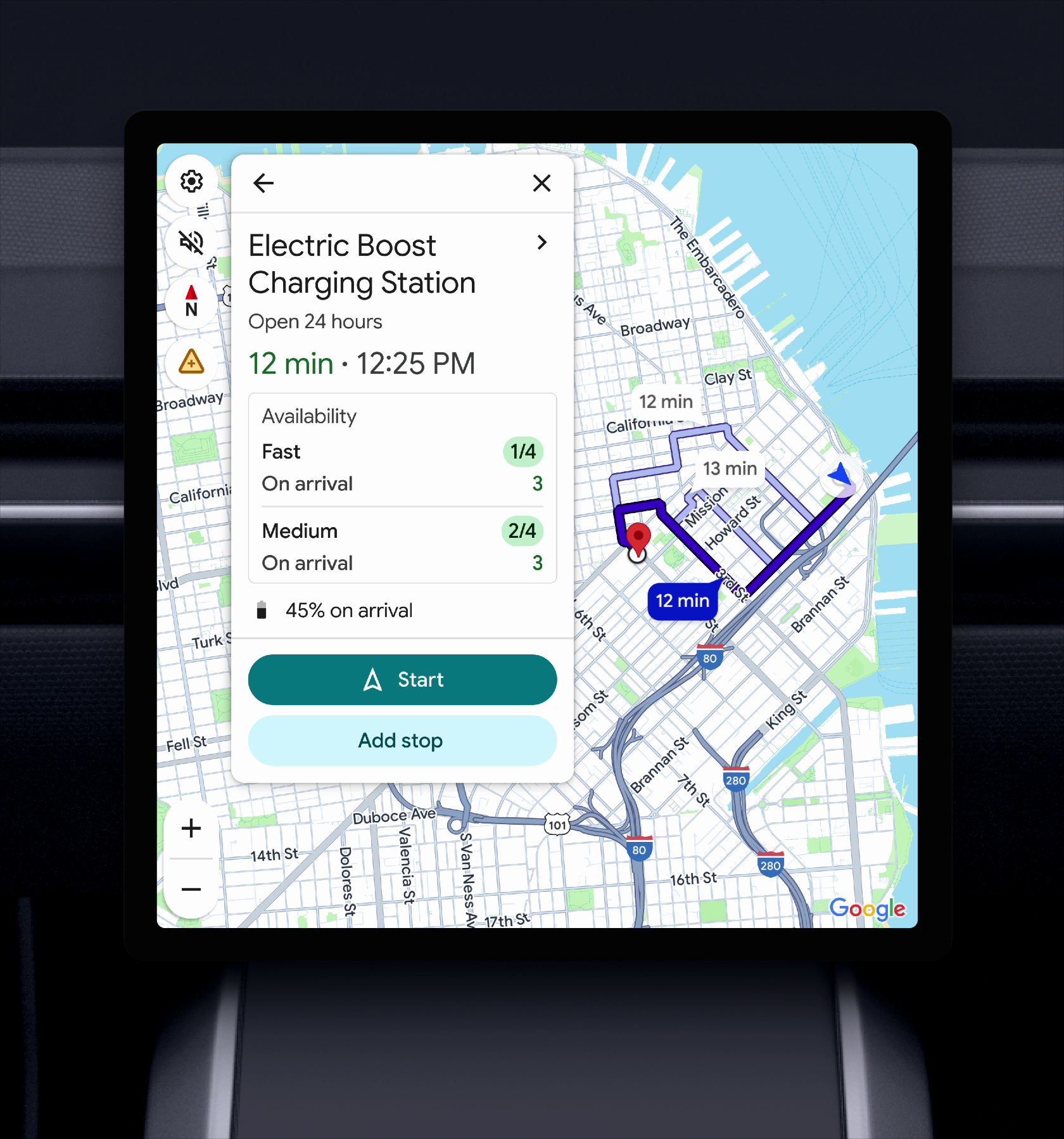 Funktionen rulles ud i næste uge i Google Maps til Android Auto og biler med infotainmentsystemet Android Automotive med Google built-in – det vil sige med Google-tjenester inkluderet.