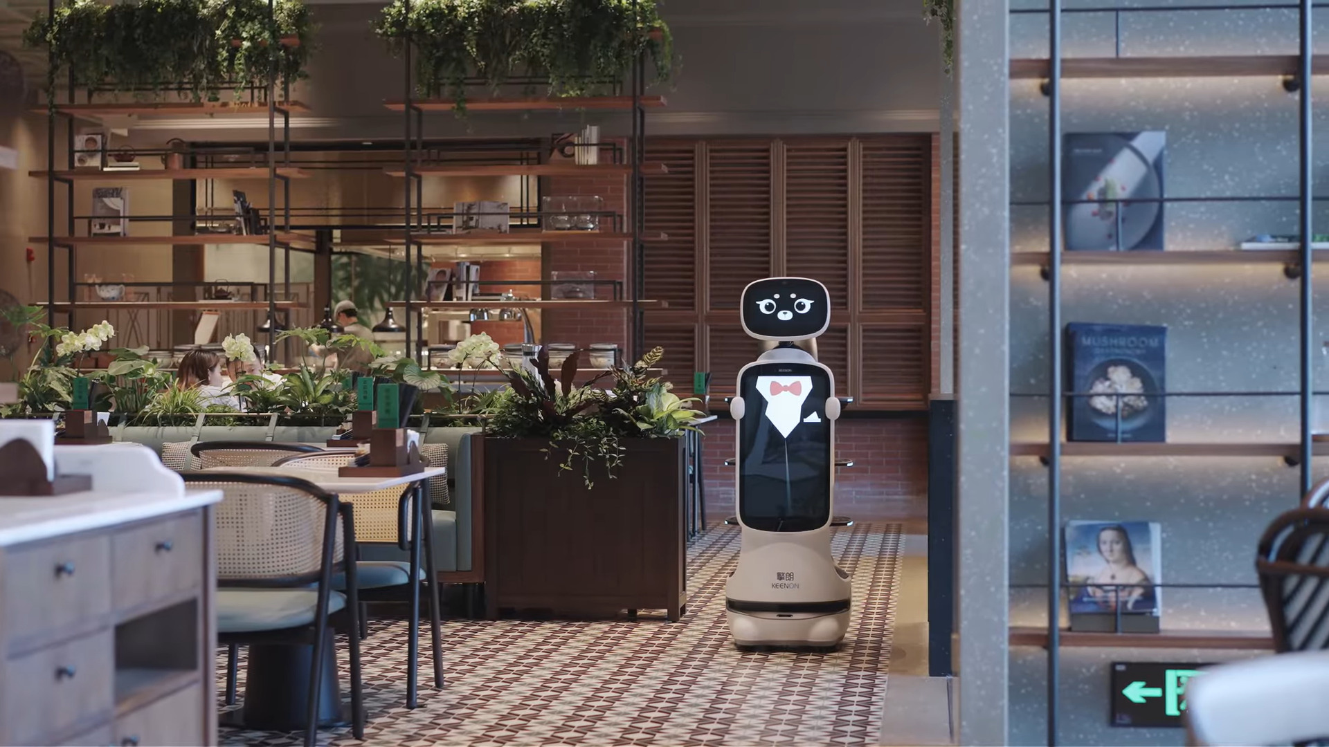 I centrum står XMAN-R1, der er en menneskelignende robot fra Keenon Robotics. Den tager imod gæster, fører samtaler og udleverer velkomstgaver.