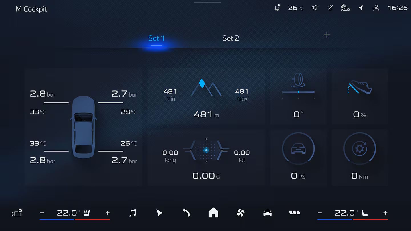 - M Cockpit: Gør din skærm til et kontrolcenter. Her kan du se alt om bilens teknik i realtid, lige fra hvordan undervognen arbejder til præcise data om motoren. Du kan selv designe op til fem forskellige visninger, så du ser præcis de tal, du synes er spændende.