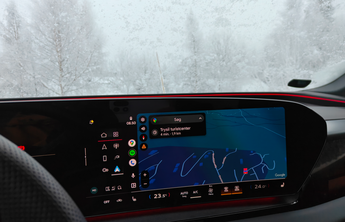 På turen mod Trysil med frostgrader, sne og delvist vinterføre kunne man tydeligt se, at rækkevidden ikke matchede rækkevidden om sommeren. Det er helt forventeligt og noget, som man skal planlægge efter.