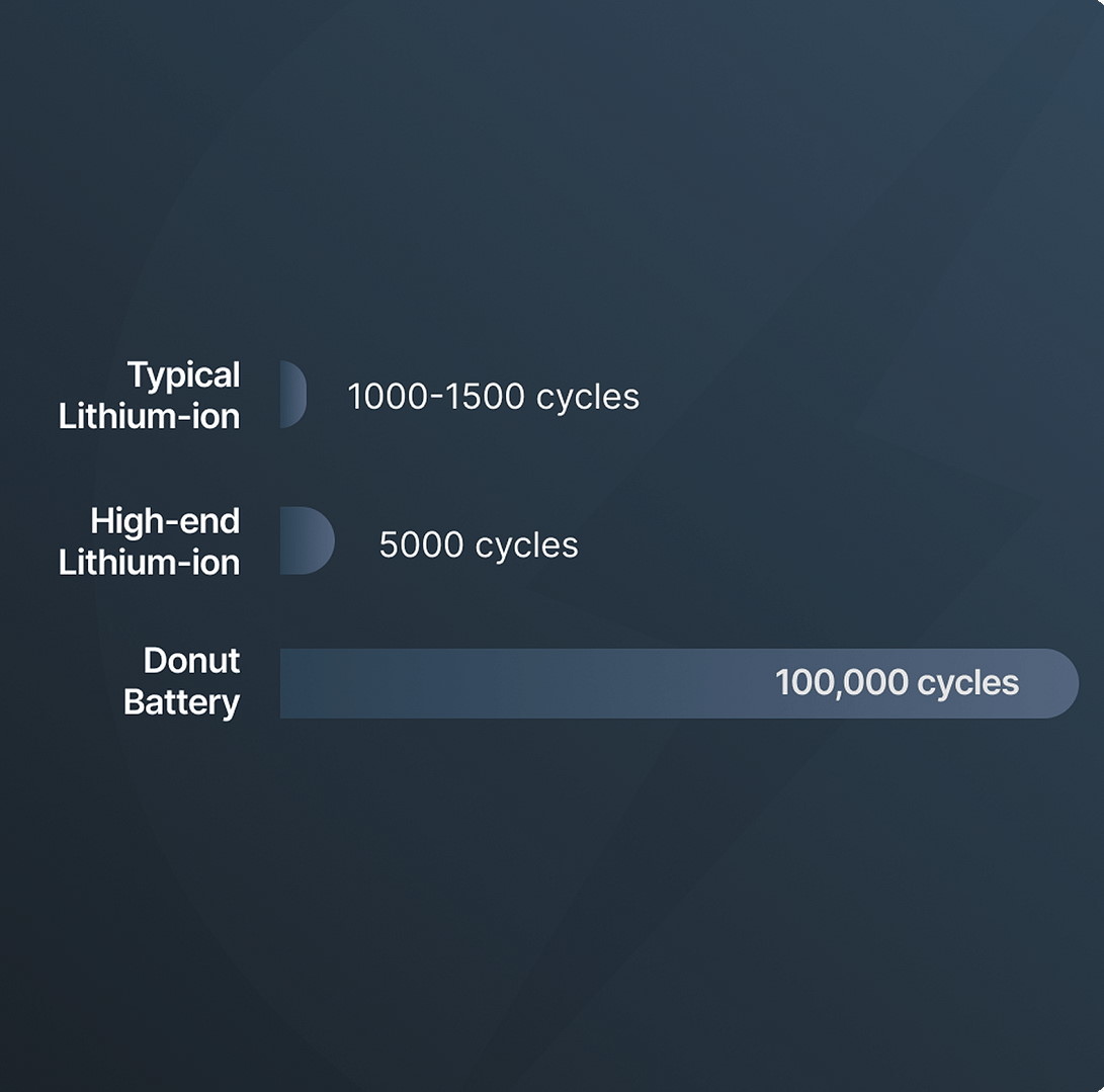Batteriet er designet til at holde i op mod 100.000 cyklusser, hvilket er hele 20 gange mere end de bedste traditionelle batterier, som typisk holder op til ca. 5.000 opladningscyklusser.