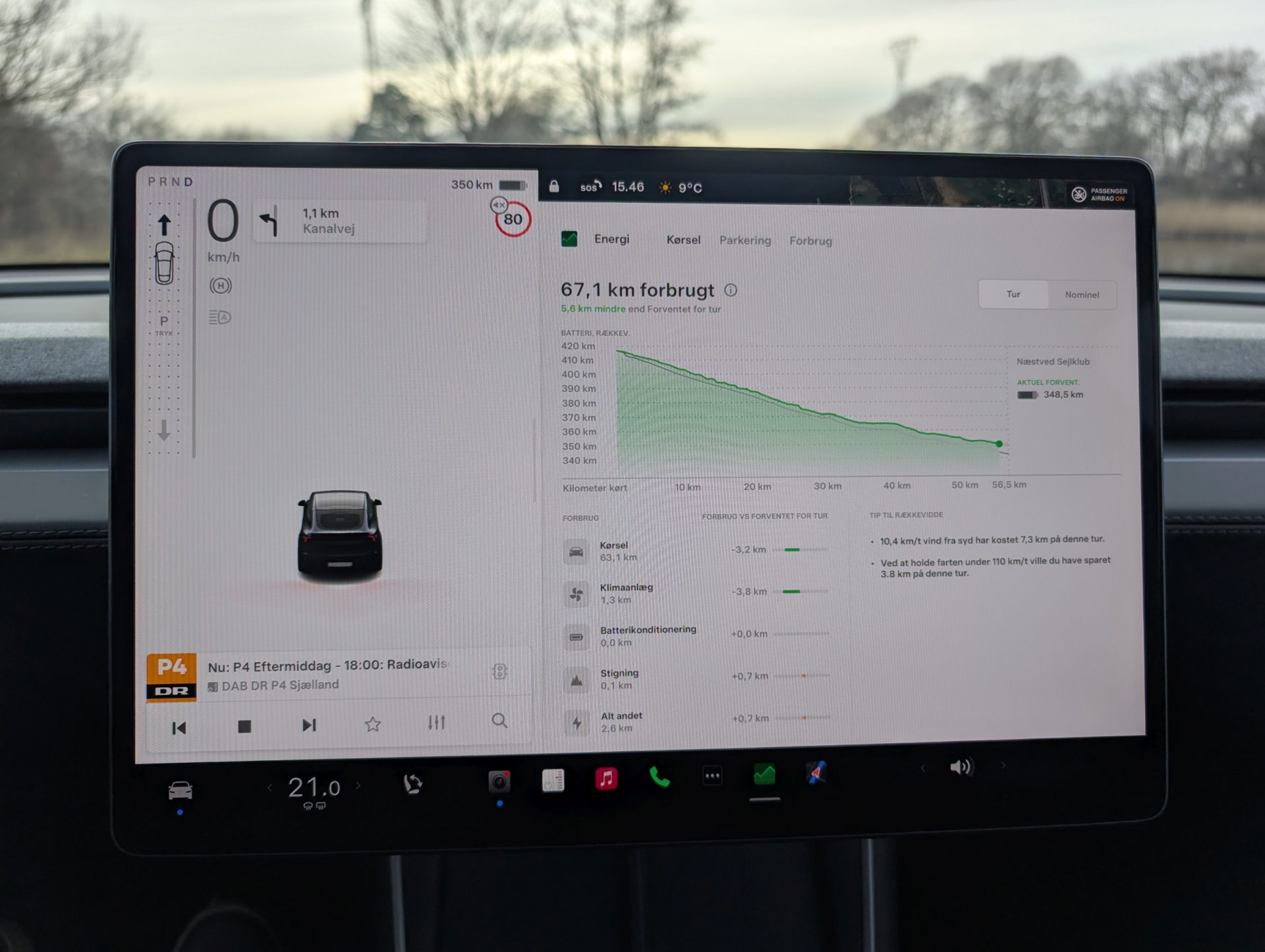 Et fantastisk element i hverdagen er desuden Teslas evne til at estimere energiforbruget. Bilens software viser en graf over det forventede kontra det reelle forbrug, og den rammer stort set altid plet. Vi bemærkede dog under vores test, at selve varmepumpen i bilen kan være en smule støjende, og at man af og til kan mærke små vibrationer forplante sig i kabinen, når den arbejder på højtryk.