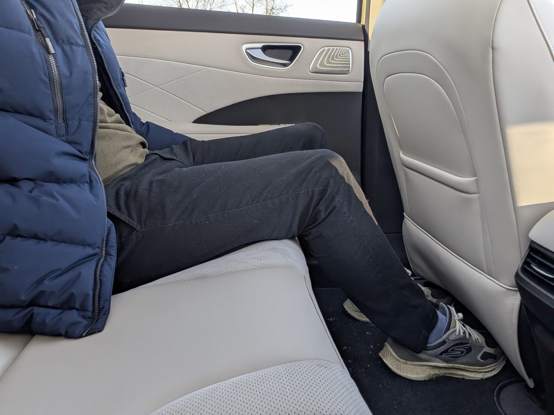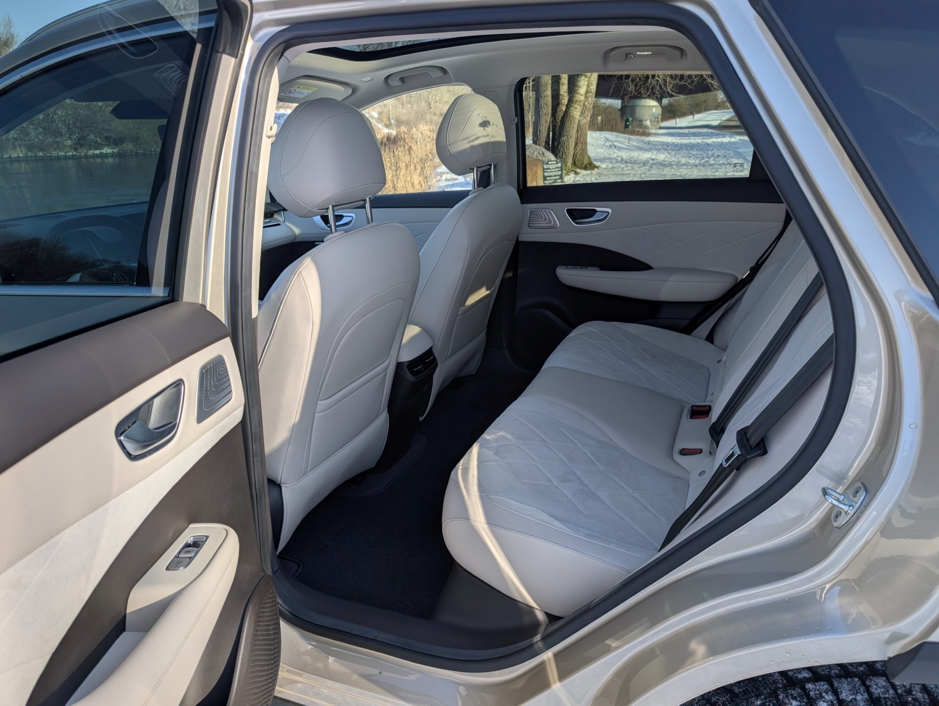 Den er marginalt kortere end en Tesla Model Y, men akselafstanden sikrer en imponerende udnyttelse af pladsen i kabinen.