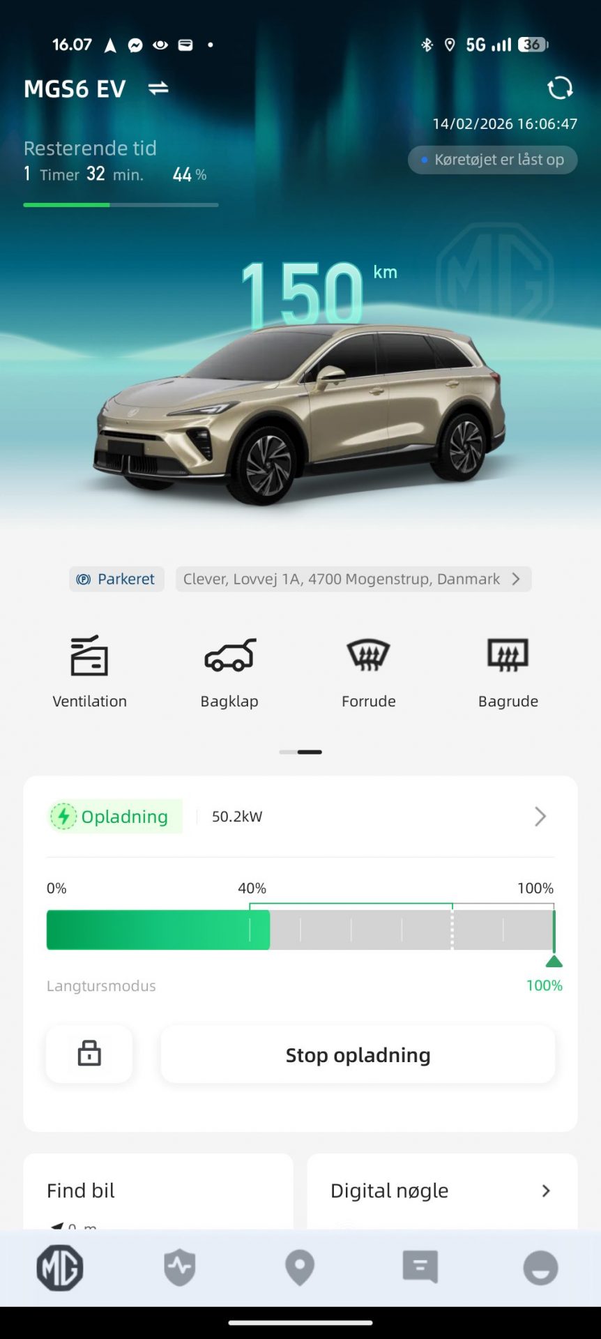Hjemme i indkørslen eller på en offentlig normallader oplader MGS6 EV med de gængse 11 kW via en AC-ladeboks, hvilket betyder, at en fuld opladning tager 7 timer og 10 minutter. Det dækker behovet for langt de fleste, der lader natten over.