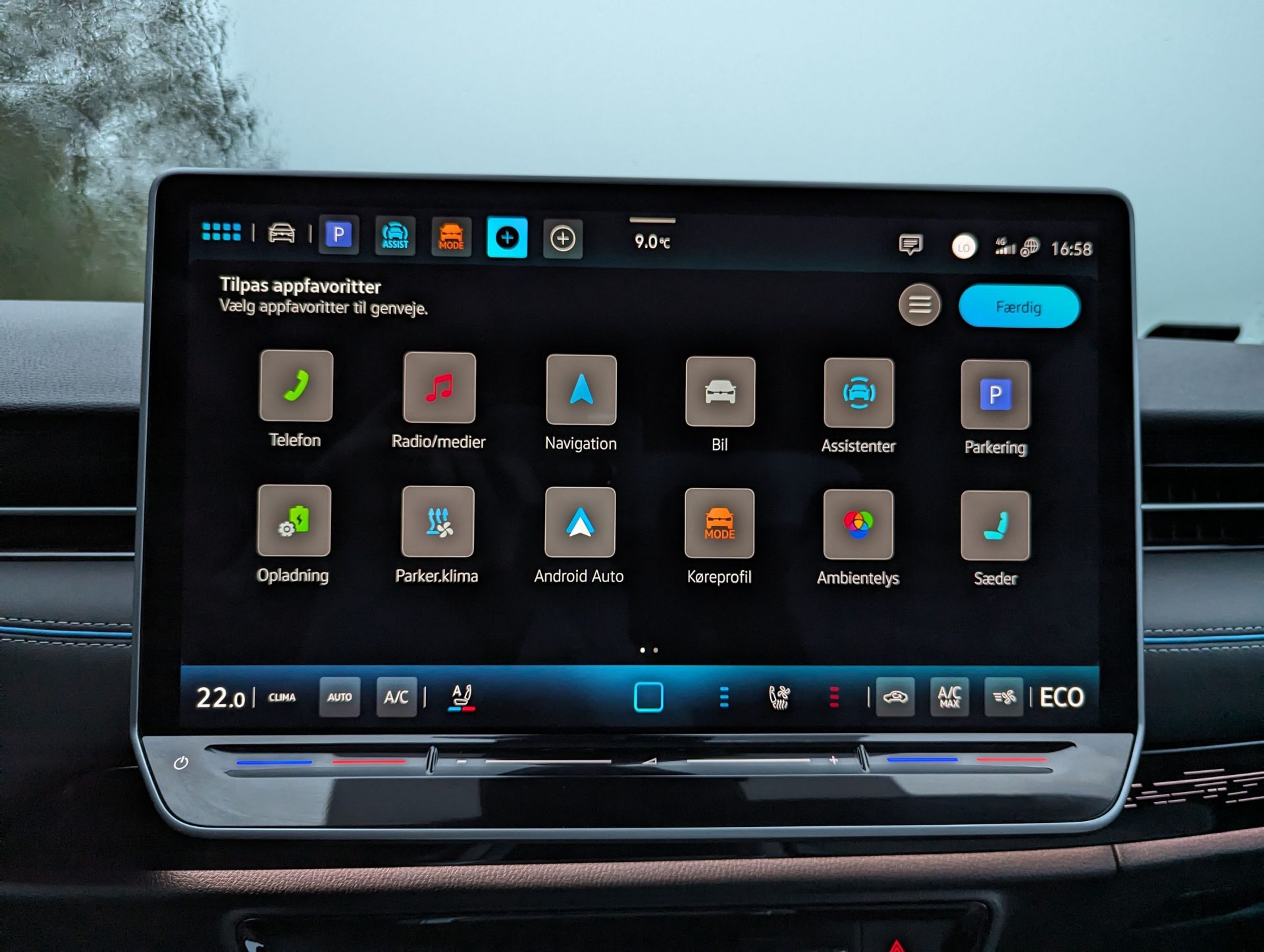 Skærmen har høj opløsning, flotte farver og en hurtig responstid. Volkswagen har lyttet til kritikken og flyttet genveje til klimaanlægget ud på startskærmen, så de altid er tilgængelige.