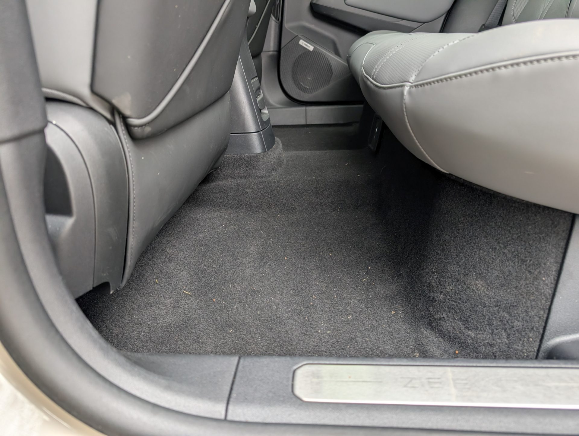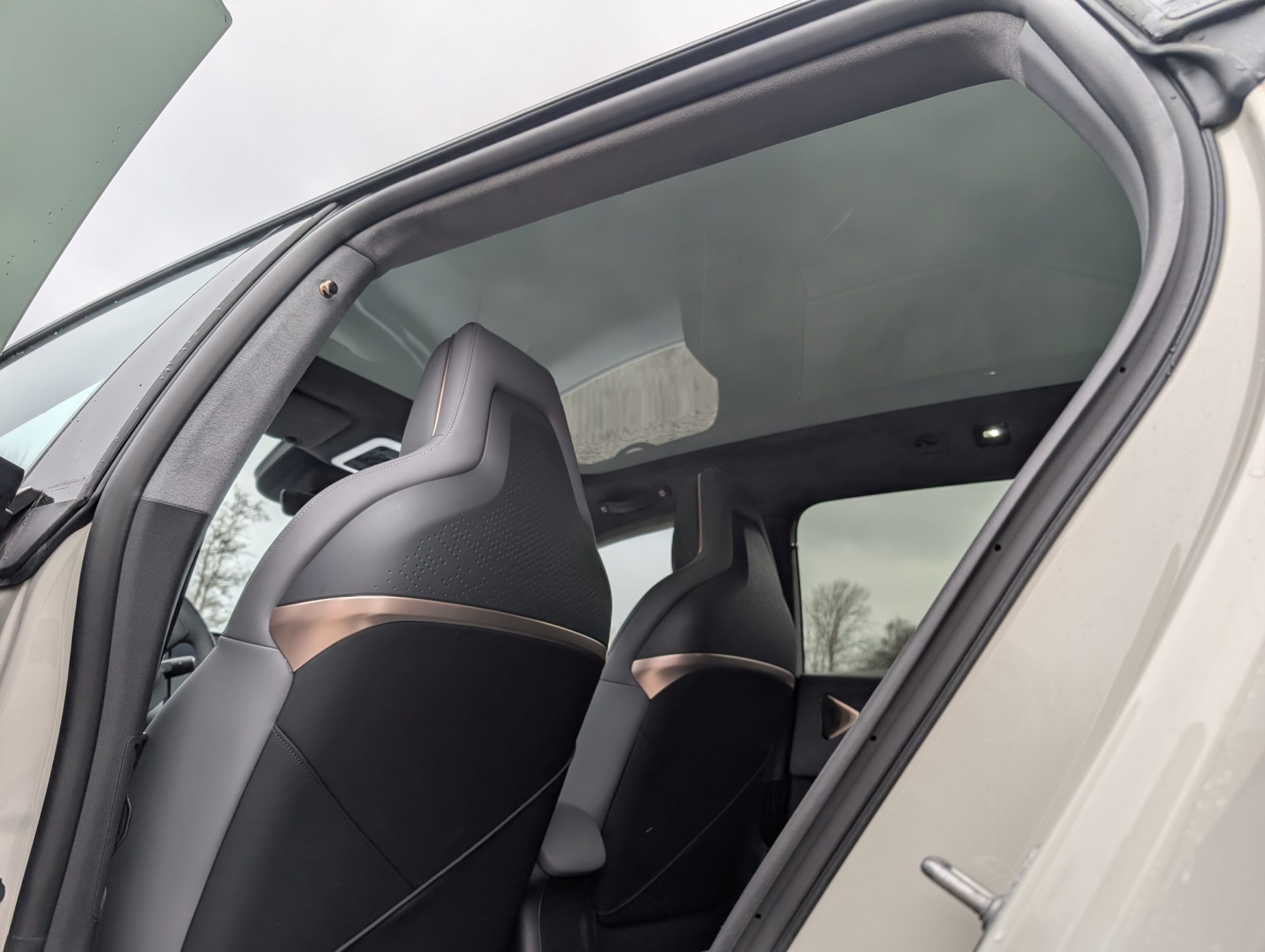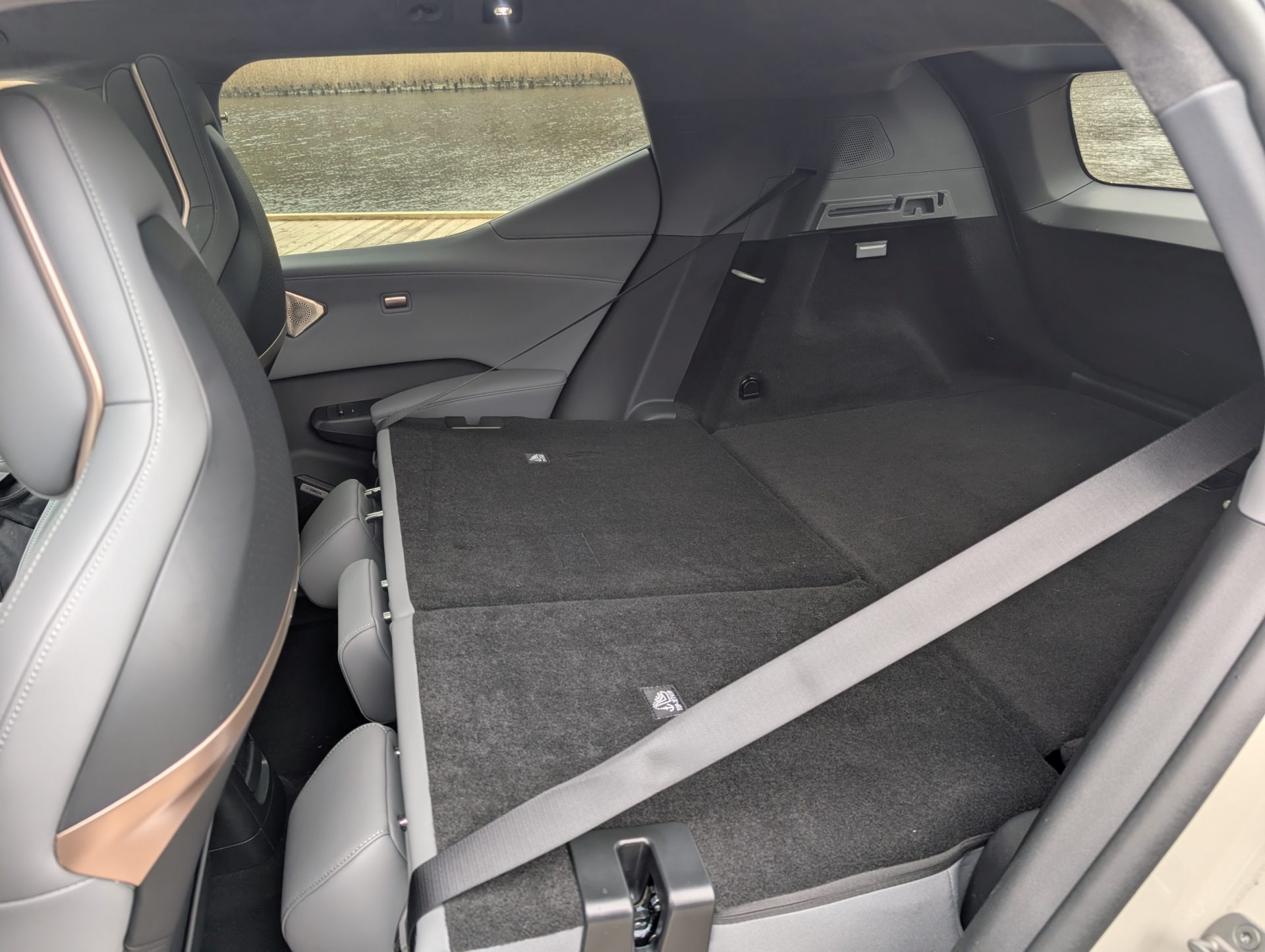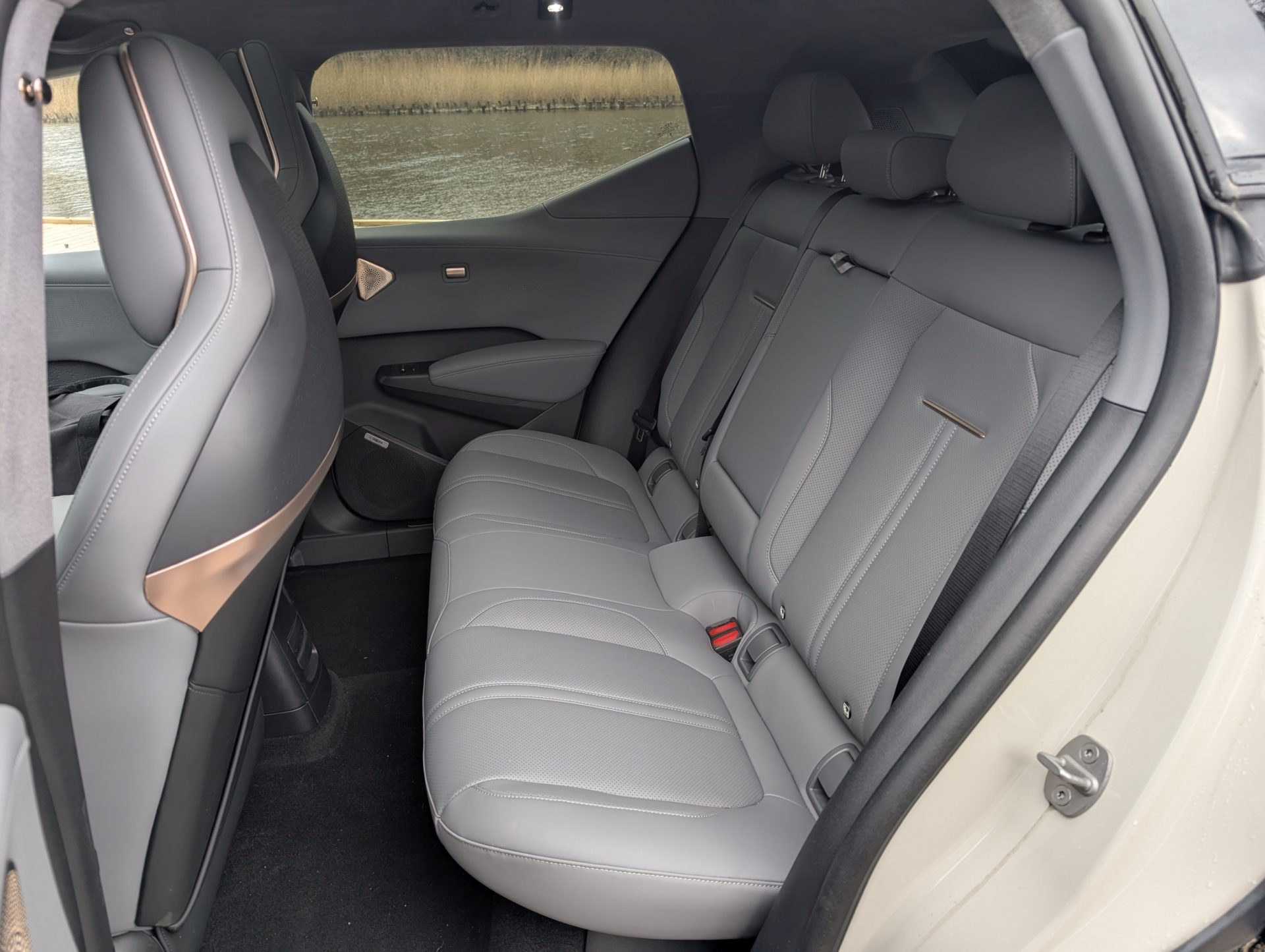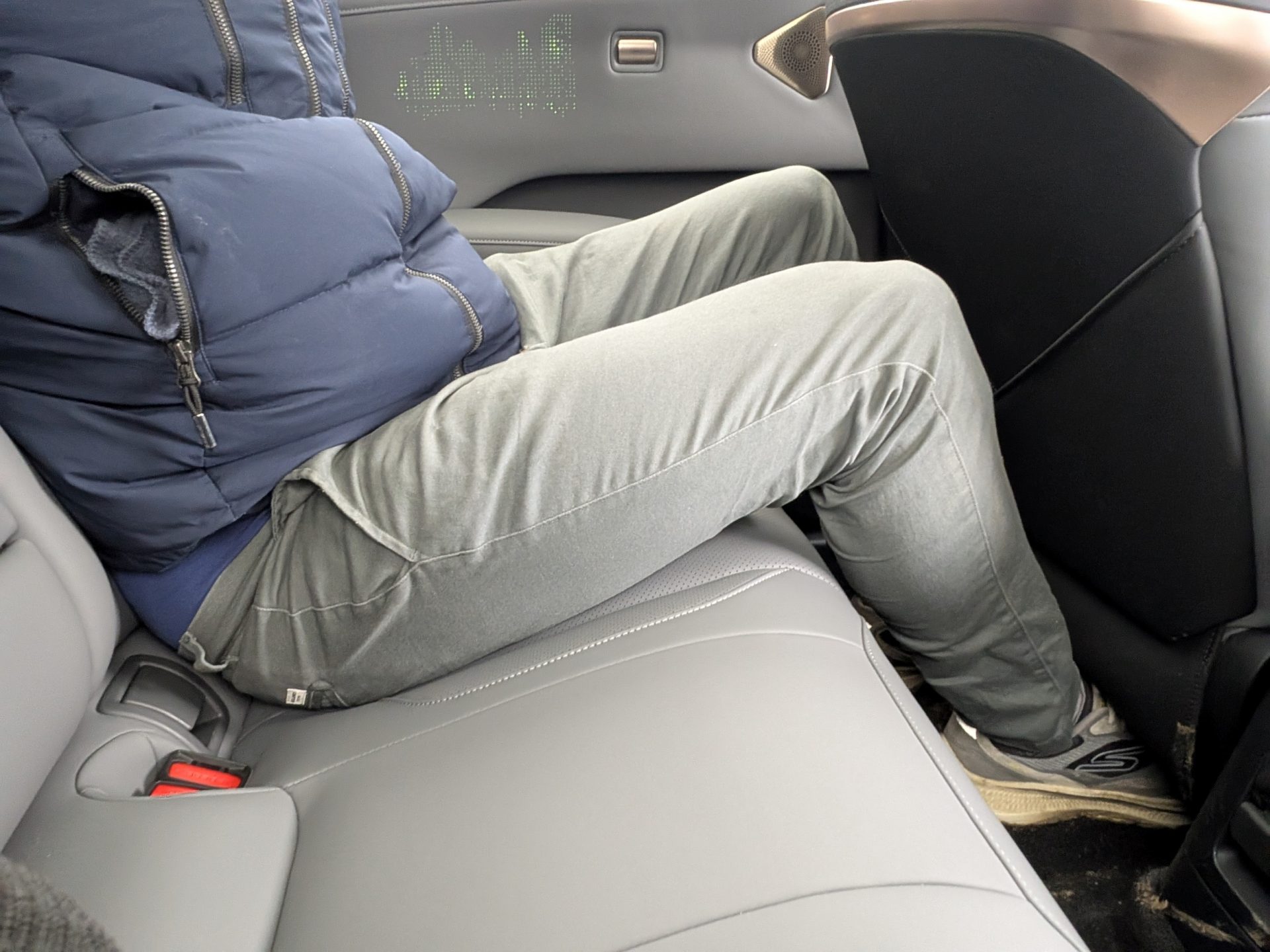 Selvom akselafstanden er lang, er benpladsen bagi desværre lidt skuffende – især hvis forsæderne er skubbet blot en anelse tilbage. Samtidig gør det højt placerede batteri i gulvet, at ens ben får en let akavet vinkel, da lårene ikke støttes fuldt ud af sædehynden.