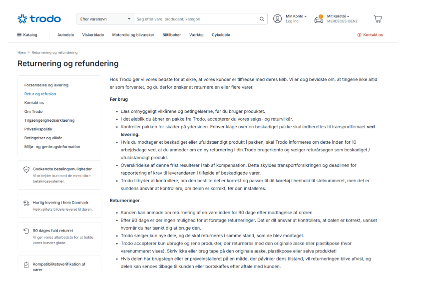 Køb af reservedele online indebærer en vis risiko, særligt hvis en del ikke passer til bilens specifikke model eller motorvariant. Ifølge oplysningerne på Trodo.dk tilbydes der 90 dages returret, hvilket giver kunden mulighed for at returnere en vare inden for denne periode, forudsat at betingelserne for returnering er opfyldt.